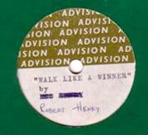 (Click on the picture for a link to information about the Record Collector Rare Record Price Guide) After he moved to the UK, the singer became friendly with Radio London's original Programme Director Ben Toney (see Ben's Memoirs, Part 15). By 1967, after failing to set the UK charts alight, Henry had retreated to Italy to try and make his name in spaghetti westerns. He arranged Ben's accommodation in Rome when Ben was also pursuing a celluloid career. On their Raresoulman website in February 2011 John Manship Records offered for sale a 1965 Advision studio acetate (i.e. A-side only) of Walk Like a Winner (sic) by Robert Henry for £100. The webmaster speculated that Gene McDaniels' song and Henry's are so similar musically, that Henry's wais probably based on McDaniels'. He described the valuable find (right) as: "British 60s power-ballad at its outermost brilliant. Inspired by Gene McDaniels' 'Walk With A Winner' this is Bob Henry's WALK AWAY LIKE A WINNER mistitled in the studio. Pre-Philips BF 1476 [pressing]." The label's typist seems to have suffered from misinformation and/or a pre-release change of plan. Henry can clearly be heard singing 'walk away like a winner' and that is undoubtedly the correct title of the song. It's hard to decipher the original typing of the artist's name, which has subsequently been scratched out and replaced by a handwritten 'Robert Henry', but if it was simply a change of 'Bob' to 'Robert' it seems unnecessary for the entire name to have been obscured. In the late Seventies, a singer/songwriter called 'Bobby Henry' released singles on Charlie Gillett's Oval label, but this was a different artist who came from Glasgow. Many thanks to Brian Long for additional information |
