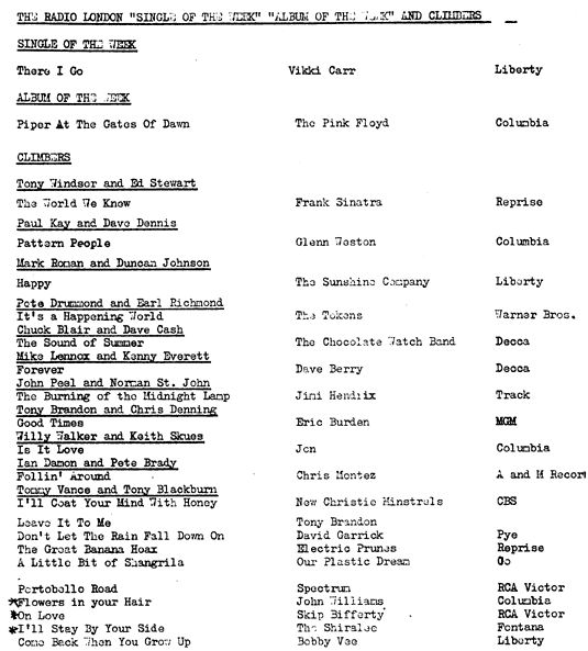 definitive playlist. Here are a few examples of what I mean. The producer of the Oldies Project Forty Years Ago programme, Kees Brinkerink and his friend Rob Mesander, had been wondering for a while why Radio London never played The Flowerpot Men's Let's Go to San Francisco or the Herd's From the Underworld, both of which became national Top Ten hits. This led to an investigation of the release dates of some of the records on the final Radio London chart. These are usually obtained from the weekly UK release sheets of the era, issued by Francis Antony. However, by the nature of the music business, the record companies were bound to have amended some of these dates. Like the Fab Forty, there are so many variables - not to mention human error. (The Francis Antony lists do contain disclaimers regarding errors and omissions.) The dates printed on labels of promo copies cannot be regarded as always accurate either, for the same reason. Dates must have got changed for simple reasons, e.g. because Decca might release a single by artist A, so Pye would bring forward the date of their version by artist B. Minor releases being pressed initially in small quantities (which probably applied to many of the climbers) might get pushed to the back of the queue for available presses if there were big demands at the plant for say, a new Beatles single. We also seem to hear of a lot of cases of lost sales because of industrial action or other problems relating to pressing plants and distribution. Incense by the Anglos and Strong Love by the Spencer Davis Group are good examples of the public wanting to purchase records they had heard played on Big L, but finding them unavailable in the shops. In Radio London's final few weeks, the record companies were clamouring to have their latest singles played. With most of the offshore stations closing, Caroline's future far from certain and Radio One not opening till September 30th (and in any case, still subject to needle time) airplay of any new releases was bound to be restricted and competition for a few final Radio London plays would have been fierce. As Brian says, records were being shipped out daily. An amazing 73 singles were crammed into the last Big L playlist and we believe that others were aired that were not on the list. Three records that had been high in the previous week's chart were suddenly relegated to the Soul Set and Ballad Box to make way for others to enter the Fab 'Forty'. As Brian has pointed out, it becomes evident that it is virtually impossible to know precisely what was played during Radio London's final days. Let's Go to San Francisco saw its official release on 04/08/67 and From the Underworld, on 11/08/67, but other singles that came out around the same dates – some of them not on sale till September – did feature on the final Big L playlist. We can but speculate as to why some made the list and some did not, but in a lot of cases, sheer luck must have played its part. It's possible that the record companies were unable to rush pre-release copies to the ship in time and also possible that the office received them, but failed to send them out there. It must have been a chaotic time, both on the ship and in the Curzon Street offices. With huge sacks of farewell mail arriving daily, the Big L offices (and probably the Galaxy) were undoubtedly swamped with it. Quite a lot of things must have got lost! Kees says: "Rob Mesander spotted one instance of The Last Waltz (how appropriate!) by Engelbert Humperdinck being played on Big L, although the song seems not to have been a climber. It was released on Friday, August 18th, the same day and on the same label as We Love You by the Rolling Stones.' (See item below) Looking at my own notes from some Caroline recordings, I find that Let's Go to San Francisco was a Caroline Sure Shot in the week of August 12th and was at no. 22 on September 2nd."
