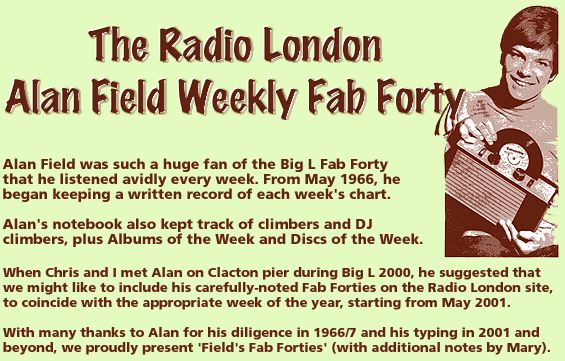 1967 (These were the first of the Fab Forty charts to appear on the Radio London website. See introduction for explanation. Since we first posted Alan Field's charts in 2001, we have received a number of additions and amendments and have been continuing, with Alan's input, to update the lists including new source references ever since. Over twenty years later, we are still updating!! ) Sunday 1st May 1966 |