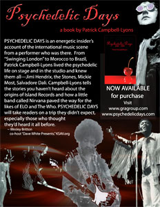 Patrick Campbell-Lyons: We didn't get to visit any of the offshore stations, but I met John Peel on a couple of occasions – a true original in every sense of the word. I also knew Mike Lennox and Dave Cash and I met Mike Raven a few times. Those pirate radio stations of the sea waves were a rare breed indeed. Thinking about it now has made me very nostalgic and I am not into nostalgia. What I really missed after the demise of those stations was their spirit and originality and the rebellious nature of it all. It was all part of that 'happening' the same as us playing live with Salvador Dali on French TV – too crazy for words! I have tried to capture it in the book and from the reviews and the reaction of the readers, they are taking the trip!