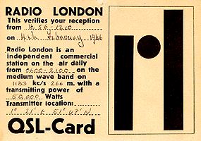 We much appreciate Hans enlightening us about offshore radio reception in Finland in the Sixties and for his useful tips on how to entertain the elderly using only a Pye record player, a 25m piece of wire and a copy of 'Wild Thing'! Many thanks, too Hans, for taking the trouble to scan the QSL cards. The Radio England one is bound to turn up eventually. We also apologise to Hans's wife for being the cause of his premature onset of senile dementia!
