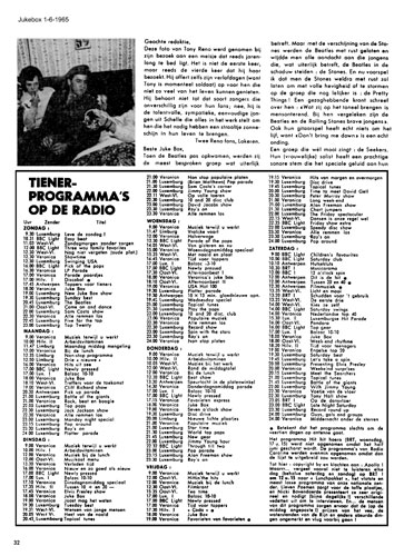 JUNE 1965 The schedule published in the June 1965 edition of 'Jukebox' is a cherry-picked compilation of listings for pop programmes that could be heard that month on local and UK stations and on Radio Luxembourg. Veronica, 208 and the BBC Light Programme are included but no other offshore broadcasters. The 'Jukebox' listings complier has covered pretty much any show on the Light Programme that played a variety of music, but might feature a pop record - such as the request shows Children's Favourites and Three Way Family Favourites. The main BBC programmes aimed at teenagers naturally held weekend slots. Saturday Club and Sunday morning's Easy Beat, both presented by Brian Matthew, featured mainly live performances with studio bands and guests from the charts. Brian Fahey & His Orchestra, The Mike Leander Orchestra and Arthur Greenslade & The Gee Men all played sessions during June 65. Special guests included Fab Forty acts Donovan, Georgie Fame & The Blue Flames, Sons of Fred and Them. Pick of the Pops was Sunday afternoon's rare, all-vinyl treat and included the eagerly-awaited weekly sales chart rundown. On weekdays at 1700, 'Newly Pressed' supplemented the meagre needletime allowance, as spinning a new single was regarded as a review. As long as the record label was mentioned the latest releases were exempt from the regulation. Saturday Club, Easy Beat and Pick of the Pops all included segments that took advantage of this 'get-out' clause. Luxembourg DJs at the time included Sam Costa, Alan Freeman, Jack Jackson, Jimmy Young, Brian Matthew with his Pop Parade and Jimmy Savile's Teen and Twenty Disc Club. Both Veronica and 208 had programmes dedicated to Elvis. Veronica also showcased Cliff Richard and 208, the Beatles. On Wednesday evenings Veronica aired the US Hot Hundred. |