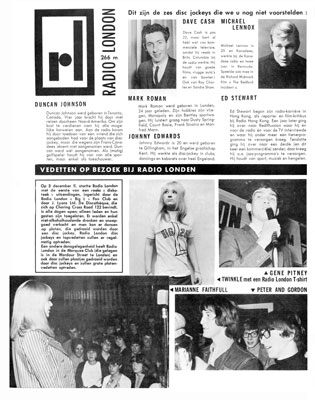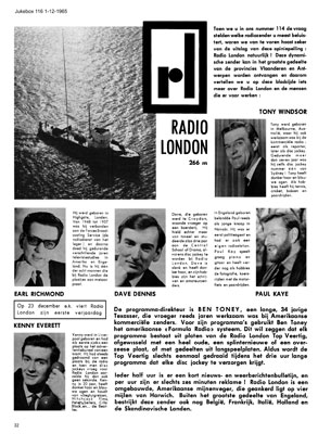 DECEMBER 1965 Jukebox marked Radio London's 1st anniversary with a photo feature. Not only are the DJs profiled, but also Programme Director Ben Toney, whose photo is presumably absent because it would would not have been included in the promotional material issued by Radlon. The magazine focussed on the fact that Ben was a Texan, that the station was run on the American Top Forty format and that the ship was a former USS minesweeper |