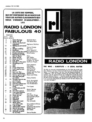 JUNE 1966 Both of these Fab Forties have the same date, but come from editions of the magazine in French (#116) and Flemish (#122). Editions of 'Jukebox' were published in both languages, with the French version launching six months earlier. Although both editions went on sale in June 1966, by the time 'Jukebox' had gone to press, the Big L Fab Forties, ironically billed as 'the charts that are always ahead of the others' were bound to be considerably out of date! No chart featured in a monthly magazine could possibly be current, although in the mid-Sixties a sales-based listing was much more likely to remain reasonably static for several weeks. The Fab Forties they printed (which must have been supplied by Radlon's Curzon Street offices) comprised Radio London's weekly playlist. Big L often gave airplay to singles that would not be in the UK shops for several weeks. Continental listeners might have to wait even longer for the release of a record they'd heard on the station. We have established that the 'Jukebox" French edition #116 features the Fab Forty for May 1st, while Belgian edition #122 carries the May 15th chart. Leaving these charts undated may well have confused readers. By the June 1st publication date, much had changed in the two Fab Forties. The May 1st #1, 'Pretty Flamingo' had left the Radio London chart; 'Wild Thing', the May 15th #1, was on its way down and had vanished by June 5th. |