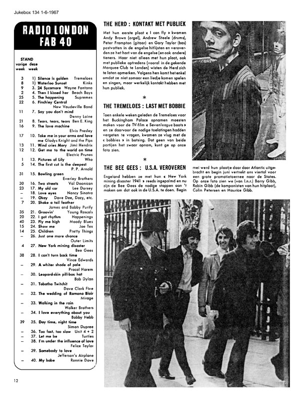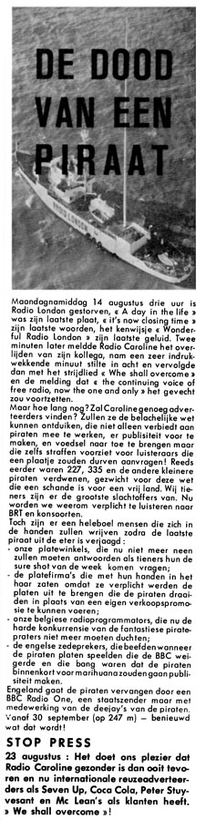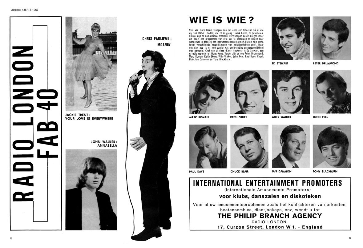 From the 'Radio London Fab 40' heading, we have to assume that a chart was published on another page of this edition. From the artists in the accompanying photo-feature it appears to be either from July 2nd or July 9th. Chris Farlowe, Jackie Trent and John Walker were all in the Fab Forties for both of these dates. The Who's Who of the Big L DJs prior to the station's imminent demise, carries an ad for the Philip 'Branch' Agency. A most unfortunate typo, as Radlon's MD Philip Birch had undoubtedly paid good rates for it, probably for the entire promotional feature.