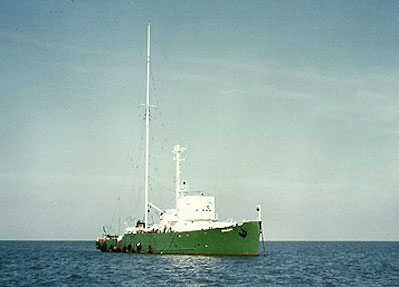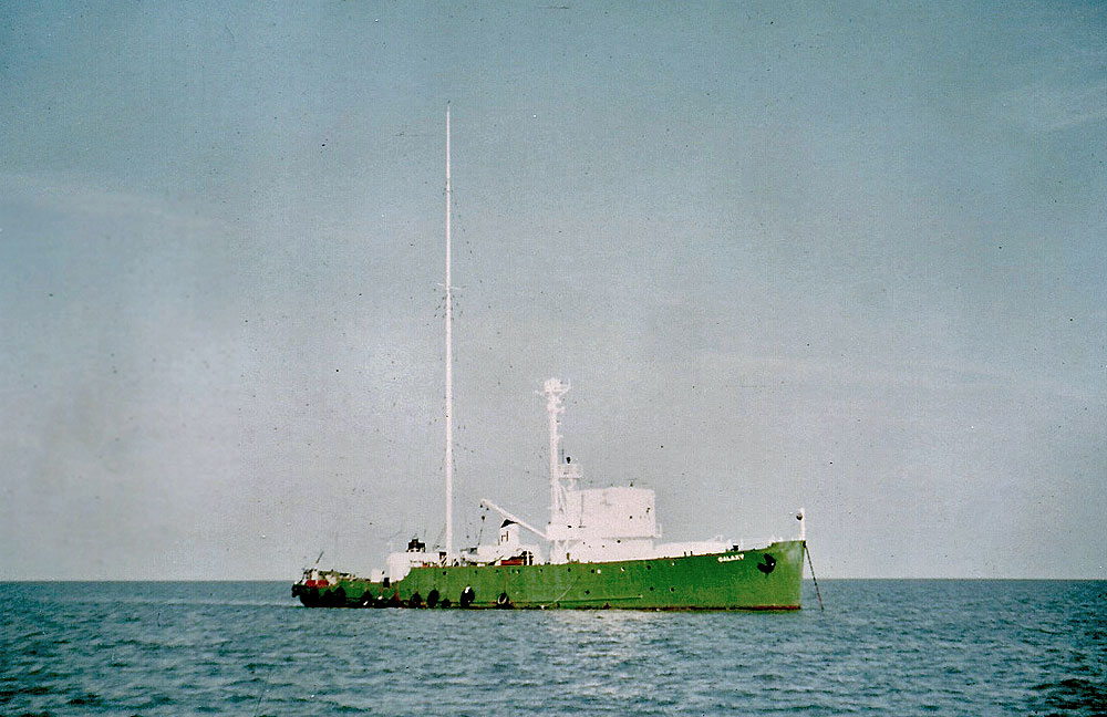 Brian Nichols also very kindly shared three colour photos of the Galaxy from 1967, when she was painted green. The pictures were supplied by David Baker, having been donated to him by a fellow offshore radio fan, who was relocating to Ireland. However, the identity of the photographer is uncertain. Nobody is sure if the person now residing in Ireland took them, or if they had been acquired from someone else. Something about which we are uncertain is whether the Galaxy was specifically repainted in advance knowing that the station was closing down and who was responsible for the repainting. Was it the crew on board, or were outside painters employed? Click on the small photos to see larger versions.) |