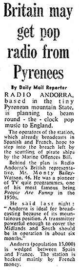 Daily Mail It was hoped that a collaboration with Radio Andorra would prove the salvation of Radio London, but this was not to be. Clipping from the Francis Pullen Collection |
