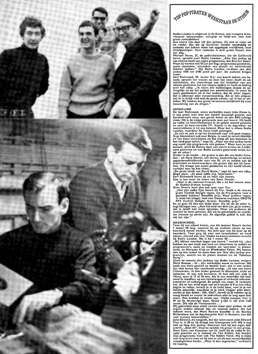 Feature from Dutch pop magazine Tuney Tunes, May 1966 (Click on the pages to see larger versions). (Top photo, right) l to r, Dave Cash, Mark Roman, John Edward, with Earl Richmond at the back. Bottom photo, Dave Dennis and Earl Richmond (minus his glasses) in the studio. If any of our Dutch-speaking visitors would care to translate the interview, we'd be very pleased to be able to include an English version. Clipping courtesy of Bert Bossink |