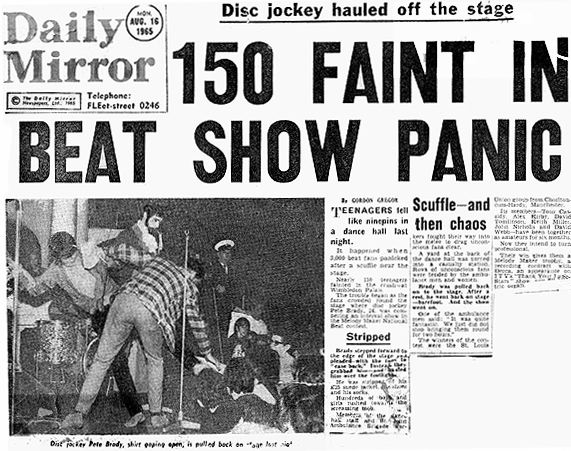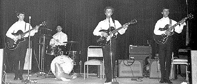 Paul Griggs and his band The Cortinas, were 'Beat Time' competitors. Paul has very kindly supplied the photos below and the above newspaper photo of all the finalists, with Pete Brady (light coloured clothes) in the centre of the front row. (Good to see some girls in there too!) As Pete is not in the dark outfit he wears on stage in the Daily Mirror photo, maybe he had to borrow clothes to replace his ripped ones? It is not known how many heats were held at the Palais (note the specially-enhanced curtains!) and on what dates. The band reached the finals, but it is possible the photo (below right), was taken on an earlier occasion, during one of the heats. Paul does not recall the earth-shattering Pete Brady event at the final! |