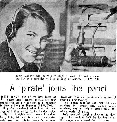 The headline- and shirt-grabbing occasion was 'Beat Time', the Melody Maker National Beat Contest at the Wimbledon Palais. Big L's Pete Brady got pulled off the stage by over-excited fans, bent on ripping off his clothes! They got his shoes, socks and suede jacket, before he was rescued. Whether or not this mobbing was a reaction to Pete's recent TV appearance as a panelist on ITV's, 'Sing a Song of Sixpence', (see photo below) is not known. The regular Radio London nights at the Palais had only commenced on July 10th. (Caroline, of course, also staged regular shows there. Steve Young met Lady Godiva there!) By early September, Saturday night audiences at the Palais had increased by 400%! Big L had been promoting the Melody Maker National Beat Contest since the beginning of the month, giving daily updates. The judges listed for the August 15th final were Kenny Everett, Muriel Young and the Hollies' Graham Nash. On the previous day, the hard-working Pete Brady had already hosted the regular Saturday Marquee Club afternoon, followed by the second of the new Wimbledon Palais Radio London Nights. Pete was already planning to leave Big L and a replacement DJ who was working at the Palais was interviewed there in late September. Graham Wallace was only too happy to take on the name of Mark Roman, which had been offered to, and rejected, by Tony Blackburn. |