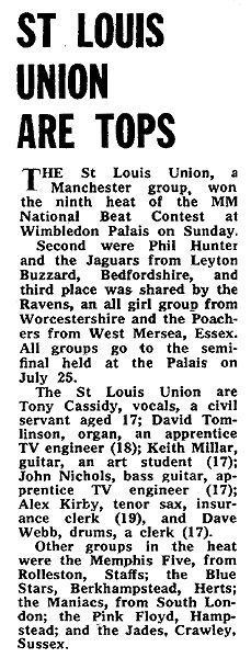 Brian Long, author of 'The London Sound', has kindly supplied a clip from Melody Maker from earlier in the National Beat Contest, when St Louis Union won heat nine. They beat an unknown outfit called Pink Floyd, who were unplaced and failed to go forward to the semi-final on July 25th. Net sources listing Floyd gigs reveal that the band appeared in heat nine on June 26th. Click on the picture to read the text. |