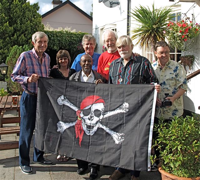Radio London flies the flag. Back row: Dave Hawkins, Mary Payne, Ed Stewpot, Duncan, Chris Payne. In front: Mich and Willy Walker