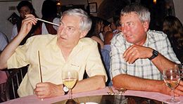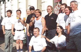 Top: Radio London supporter Per Alarud from Sweden (left) enjoying a pint with Alan Hardy. Bottom: A profusion of t-shirts. |