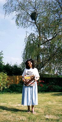 Mary, complete with Beatle haircut, badges, sweater, stockings mock-leather skirt and Please Please Me LP, taken in her parents' garden in High Wycombe in 1963. Note the willow in the background, recently planted and 'Just a Twig'.Right: Same girl, same album, same garden, different haircut, May 1998. Mary and the willow have both grown, but Mary refuses to grow up! |